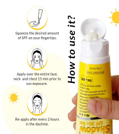 DIRECTIONS FOR USE: Apply Fixderma Shadow SPF 30+ gel liberally & evenly on the face, neck, and exposed area of skin 20 to 30 minutes prior to sun exposure. Further reapplication is only necessary after activities such as swimming or after excessive sweating