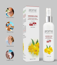 Aroma Treasures sunscreen lotion contains active sunscreen agents which provide full protection against harmful UVA & UVB sunrays. Its water resistant, non- greasy & forms an invisible layer on skin. It prevents aging & tanning. Enriched with pure essential oils no synthetic perfumes added skin friendly ingredients.