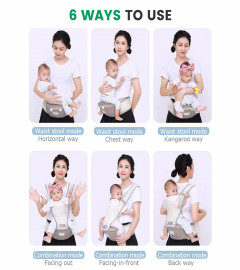 Our Baybee 6 in 1 Baby Carrier can carry your baby with this baby holders straps to your chest, on your back, or using just the hip seat. The child can be front-facing or back you. Separate or used in combination, baby wraps carrier for toddler to meet your daily needs. The toddler backpack carrier is suitable for babies aged 0-36 months and maximum weight support 15 Kgs. Baby carrier newborn to toddler, hip seat is filled with breathable sponge to enhance air flow and cushioning performance, and reduce abdominal discomfort, infant carrier backpack for newborns make the baby comfortable. Newborn baby carrier has 6 ergonomic carry positions for infants and toddlers according to the different ages of children to choose different carry ways. horizontal way, chest way, kangaroo way, facing in front, facing out, back way. Baby Holder Carrier uses cotton material, natural, soft and comfortable, breathable, skin-friendly and durable. Baby carrier will not harm the skin of the baby and parents. This soft, lightweight and secure baby carrier is good to use to free mum's hands up and help parents multi-task better. Babies love the bond of the close snuggle, your baby needs a lot of closeness around the clock. This carrier satisfies the child's primal need for body contact, warmth and security, also acts as a privacy screen for sleeping and breastfeeding.