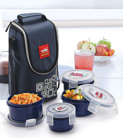 Cello Max Fresh Click Polypropylene Leakproof Lunch Box Set with Bag, 4 Containers - 300ml x 3 & 140ml, Dark Blue
