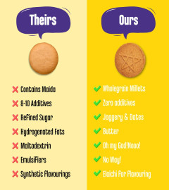 These cookies are made fromMillets, pulses, Jaggery, Superior quality dry fruits & seeds that add natural vitamin and mineral supplements to your child's diet.