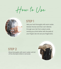 How To Use: Wet your hair thoroughly with warm water. Moisten the bar and then rub it directly through your hair from scalp to ends, working up a thick lather with the pads of your fingers (do not use your fingernails). Rinse thoroughly with warm water until all of the shampoo lather is removed.