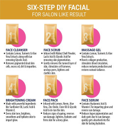6 Step Single Use D-Tan Facial Kit to Fight Sun Damage & Restore Radiance; Gives Salon-Like Results! Restores natural skin radiance and brightens skin Lightens skin tone by removing tanning and reducing melanin production Fades blemishes and spots Infused with potent, natural ingredients; 100% vegan and cruelty-free