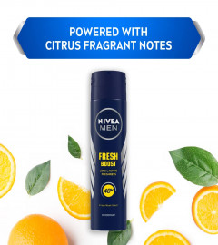 Nivea men fresh power boost deodorant, for men who want to feel fresh all day with a boost of powerful masculine fragrance.managing a job, maintaining a home, and having a social life means that there are never enough hours in the day. A fresh start is a must!Nivea men fresh power boost deodorant is for men who are always on the run. A men’s deodorant that gives you a powerful boost of freshness and day long protection from body odour. This body spray for men comes with a warm musk and citrus fragrance notes, which keep you in high gears, throughout the day.enriched with an optimal combination of reliable deodorant protection and Nivea men care complex, this deo for men keeps you refreshed while caring for your skin, unlike other deodorants for men. It has been tested and dermatologically proven to be skin it an office presentation or attending a social event, take the day head on, with the confidence of day long freshness and body odour protection. It starts with you!