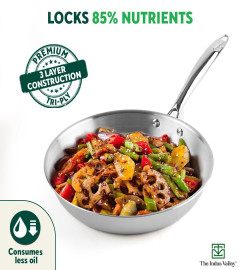 The Indus Valley’s Tri-ply Stainless Steel Kadai will give you a highly satisfying cooking experience, without compromising on your health and ease of cooking. Trust this chemical-free and food-safe tri-ply stainless steel Kadai for cooking a variety of dishes including gravies, curries in large quantities and also, deep frying. It’s even heat distribution factor helps to preserve 85% of food nutrients. What’s more is that; you don’t have to worry about its cleaning and maintenance! Because there are very few chances of food burning and food sticking in this Tri-ply Stainless Steel Kadai. That means, no burnt stains or scrubbing issues. Simply wash with dishwashing soap, wipe dry and store! Cooking healthy food is thus easier, hassle-free and without any chemicals! Our assurance that this will be the best stainless steel Kadai that you ever had. Don’t forget to check out The Indus Valley’s amazing stainless steel cookware sets as well!
