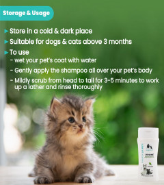 Suitable for dogs & cats above 3 months of age. To use, wet your pet’s coat with water, gently apply the shampoo all over your pet’s body, mildly scrub from head to tail for 3-5 minutes to work up a lather and rinse thoroughly.