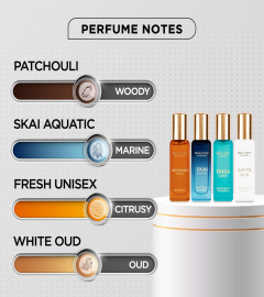 A set of 4 mini perfumes, including the iconic fragrances of white oud, skai aquatic, fresh unisex and patchouli unisex.