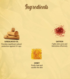 Key Ingredients: Infused with the goodness of Sandalwood oil that helps sooth, protects, and defends against UVA rays. Along with Saffron that reduces skin pigmentation and Honey helps purify heal and soothe the skin.
