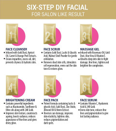 Step Single Use Gold Facial Kit for Radiant, Glowing Skin; Gives Salon Like Results! Boosts skin radiance Enhances elasticity Reduces pigmentation and lightens skin Fights sun damage Infused with potent, natural ingredients; 100% vegan and cruelty free