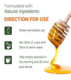 Serving Recommendation: Shake Well Before Use, Mix 30 ml pf Juice with 30ml of warm water, Take empty stomach in the morning and 30 min post dinner | All-Natural Ingredients: Free from artificial additives & preservatives