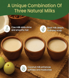 TRIPLE CARE FORMULA This oil works through a powerful three-way action: It penetrates the scalp for deep hydration, nourishes hair follicles with a Triple Milk Formula—Goat Milk, Cow Milk, and Coconut Milk—for improved hair growth and softness and forms a protective shield over the scalp and strands to reduce dryness, frizz, and breakage. A perfect herbal hair oil for hair nourishment and growth, it helps restore balance and shine from root to tip
