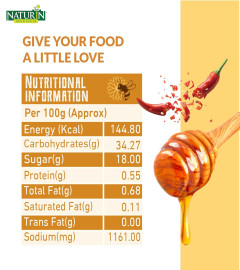 Elevate your meals with Naturin Honey Chilli Sauce, a delectable blend of sweetness and spice that will tantalize your taste buds. This 100% vegetarian and gluten-free honey chilli paste combines the rich flavors of honey with a kick of chilli, creating a perfect balance of sweet and spicy. Sweet & Spicy Fusion Naturin Honey Chilli Sauce offers a unique combination of sweet honey and fiery chilli, resulting in a flavorful paste that adds depth and excitement to any dish. The sweetness of honey complements the heat of chillies, creating a harmonious blend that’s both vibrant and versatile. This sauce is ideal for those who love a sweet-spicy kick in their culinary creations. Ingredients: Water, Sugar, Liquid Glucose, Emulsifier & Stabilizer (INS1422, INS415), Red Chilli Flakes (1.80%), Spices & Condiments, Sesame Seeds, Acidity Regulator (INS260) CONTAINS PERMITTED CLASS II PRESERVATIVES (INS211) Allergen Advice: Contains Sesame Seeds NUTRITIONAL FACTS Per 100g (Approx.) Energy (Kcal) 144.80 Protein (g) 0.55 Carbohydrates (g) 34.27 Total Sugar (g) 18.00 Total Fat(g) 0.68 Trans Fat(g) 0.00 Saturated Fat(g) 0.11 Sodium(mg)1161.00