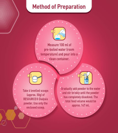 Resource® Dialysis is a nutrition supplement for dietary management of individuals on maintenance hemodialysis. Resource Dialysis contains 24g of protein per 100g of powder. Resource Dialysis contains low Potassium and Phosphorus. Usage: Measure 100 ml of pre-boiled water (room temperature) and pour into a clean container. Step2- Take 6 levelled scoops [approx. 50g) of RESOURCE® Dialysis powder. Use only the enclosed scoop. Step 3- Gradually add powder to the water and stir briskly until the powder has completely dissolved. The total feed volume would be approx. 147 ml. Storage Information - Replace the lid tightly after every use and store in a cool, dry and Hygienic place.