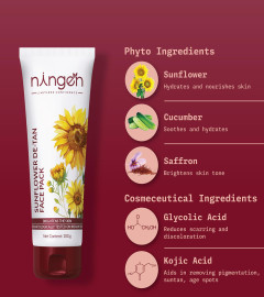 Ningen De-tan Pack with sunflower, cucumber, saffron and olive extract along with salicylic acid helps cleanse skin without stripping away natural oil and removes excessive tan.