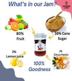 Jams do not always have to be filled with sugar. We believe that jams needs to be reformed and the focus should be fruits- not sugars or chemicals. Orchard Lane Mixed Fruit Jam is made with the finest fruit and bare minimum sugar. We have the highest fruit content at 80% fruit in each jar - and still being 100% natural- with no presrevatives, colours or chemicals. Made with 7 different varieties of hand-picked fruits Lab tested for its nutrition content Only 10 calories per teaspoon
