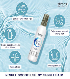 Streax pro leave in conditioner revitalizes dry hair by coating each strand with an ultra shiny nutritive film from root to tip. It penetrates hair shaft easily and preserves the moisture and softness making it silky smooth and healthy in all weather.