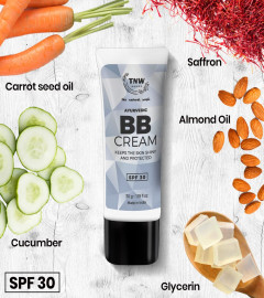 AYURVEDIC BB CREAM: TNW Ayurvedic BB Cream is enriched with beneficial ayurvedic ingredients such as carrot seed oil, cucumber, saffron, almond oil and glycerine which make this cream beneficial in not just providing medium coverage but also several vitamins and nutrients to the skin