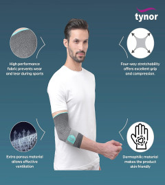 Tynor elbow support urbane is widely used in orthopaedic practice to provide firm compression, warmth & support to the forearm and the elbow joint, to allay pain inflammation and stiffness, generally associated with old age, arthritis, sports injury etc.