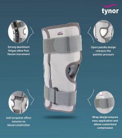 Tynor Functional knee Support, offers the advantage of controlled compression around the knee and a rigid lateral support and immobilization. It allows normal flexion and free movement of the knee joint. Because of front opening is convenient to apply and remove.