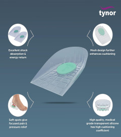 Tynor Heel Cushion (Silicone) is designed to provide soft cushioning to the foot heel. Gel spot at the site of calcaneus distributes and reduces pressure and relieves pain. Anatomically designed for better comfort and fitting.