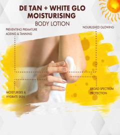 One stop solution for both tanning and dryness woes - VLCC De Tan + White Glow Moisturising Body Lotion SPF 30 PA+++ is an effective, soothing formulation that moisturises and soothes the skin while offering sun protection against UVA and UVB rays. This paraben-free body lotion is enriched with goodness of Aloe Vera, it soothes the skin, brightens skin tone, moisturises & hydrates while also actively fading tan, thus preventing premature aging and leaves your skin nourished & glowing.